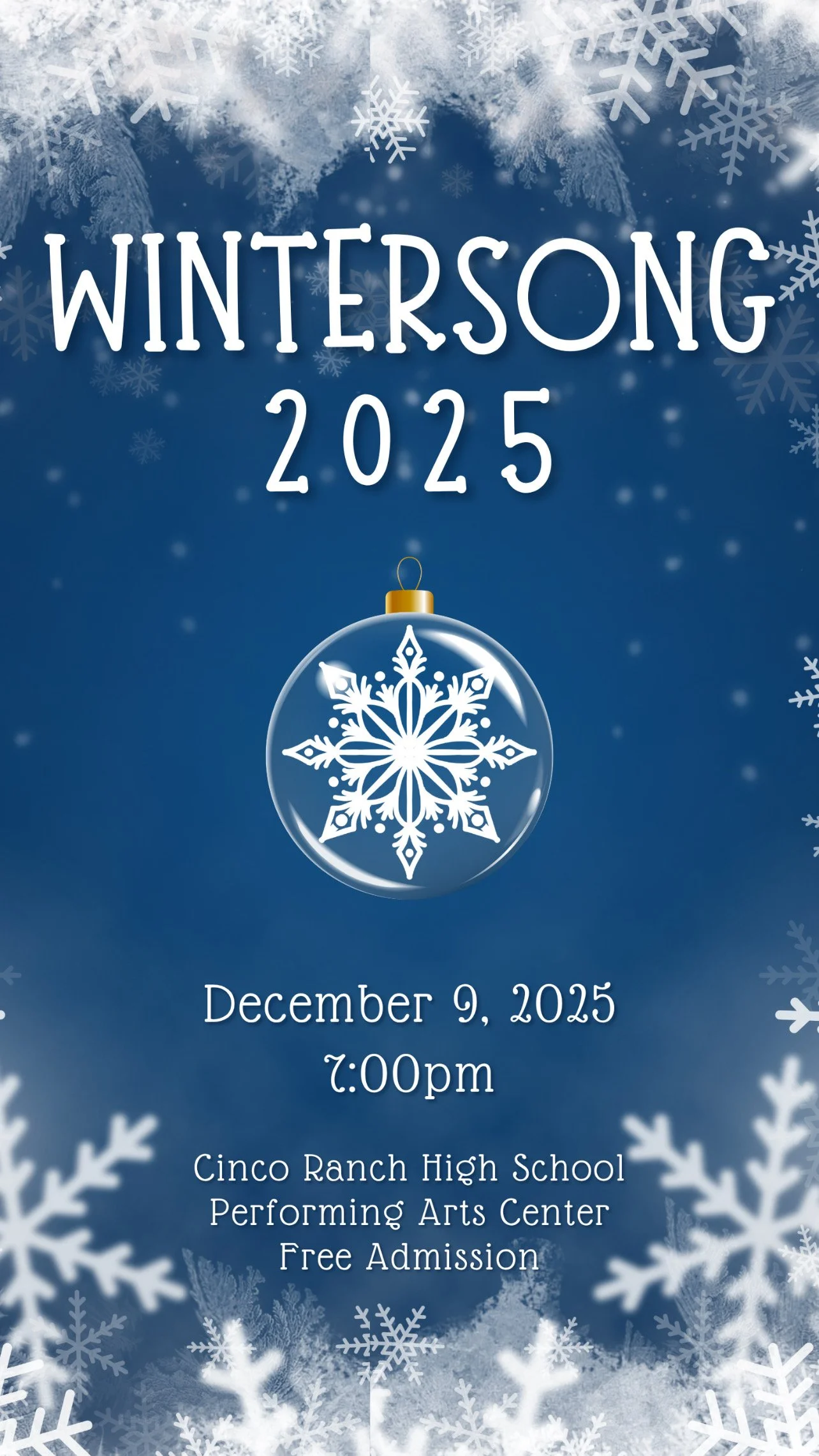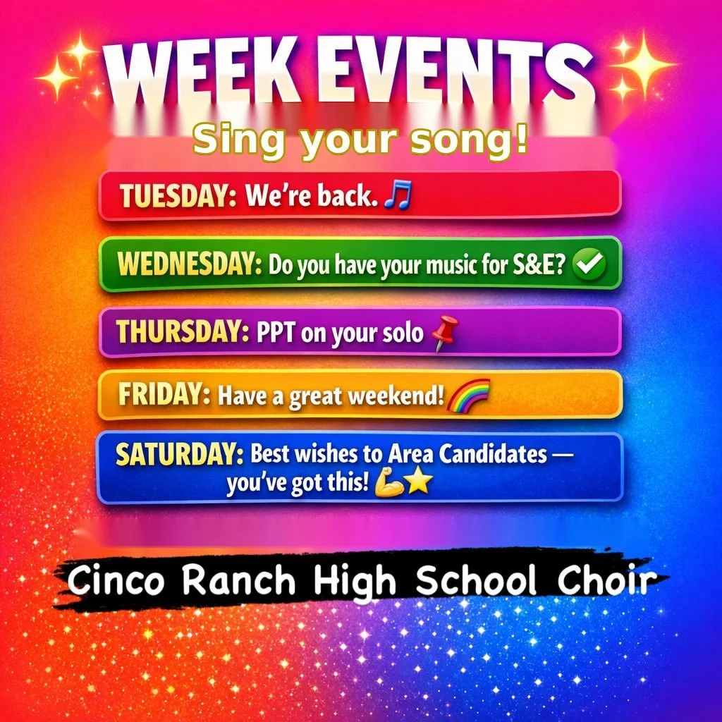 Welcome to the Cinco Ranch High Choir website! You can find information about the CRHS choir program as well as news about upcoming events and concerts. Our choir motto is Sing Your Song—and we believe in it wholeheartedly. To us, it means more than singing beautifully (though we do a lot of that!). It means encouraging each student to be fully themselves, to express their unique voice and personality, and to feel supported by a family of peers who share a passion for music.